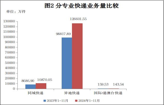 1-11月,同城博彩app-博彩网址导航量累计完成10870.05万件,同比增长25.13%;异地博彩app-博彩网址导航量累计完成126601.55万件,同比增长28.12%;国际/港澳台博彩app-博彩网址导航量累计完成143.54万件,同比下降10.02%。