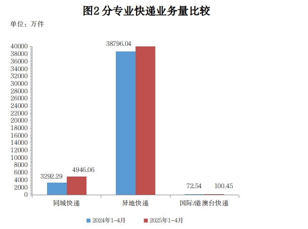 1-4月,同城博彩app-博彩网址导航量累计完成4946.06万件,同比增长50.23%;异地博彩app-博彩网址导航量累计完成5.26亿件,同比增长35.52%;国际/港澳台博彩app-博彩网址导航量累计完成100.45万件,同比增长38.46%。