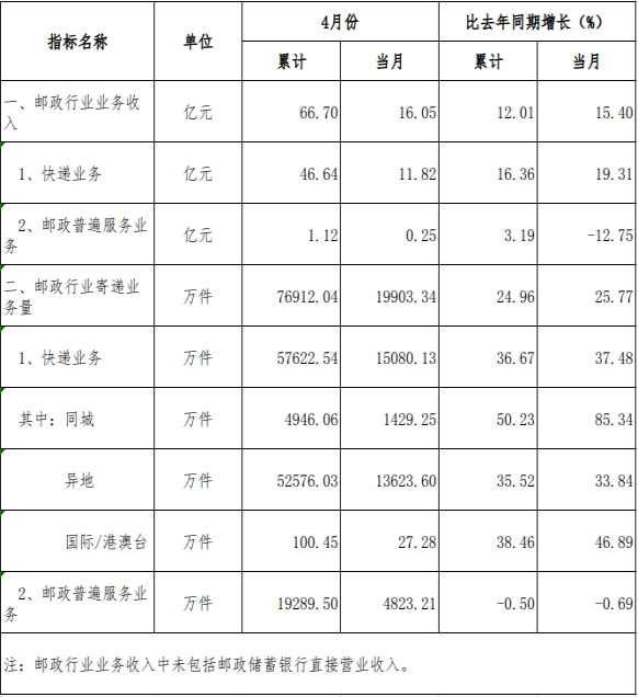 4月份,邮政行业业务收入(不包括邮政储蓄银行直接营业收入)完成16.05亿元,同比增长15.40%。其中,博彩app-博彩网址导航收入完成11.82亿元,同比增长19.31%。