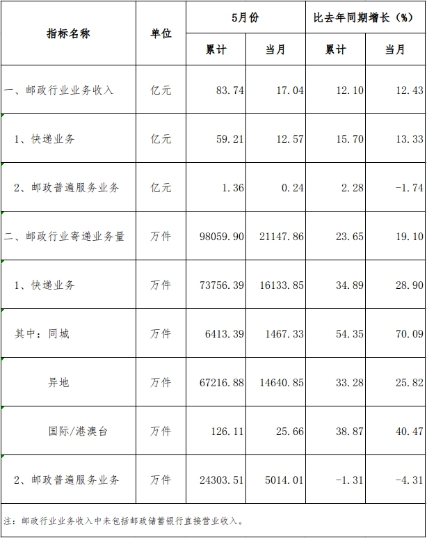 5月份,邮政行业业务收入(不包括邮政储蓄银行直接营业收入)完成17.04亿元,同比增长12.43%。其中,博彩app-博彩网址导航收入完成12.57亿元,同比增长13.33%。