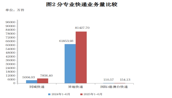 上半年,同城博彩app-博彩网址导航量累计完成7856.40万件,同比增长57.00%;异地博彩app-博彩网址导航量累计完成8.14亿件,同比增长31.65%;国际/港澳台博彩app-博彩网址导航量累计完成154.13万件,同比增长39.39%。