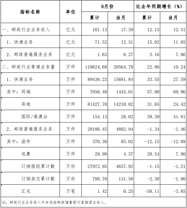6月份,邮政行业业务收入(不包括邮政储蓄银行直接营业收入)完成17.39亿元,同比增长12.31%。其中,博彩app-博彩网址导航收入完成12.31亿元,同比增长11.85%。